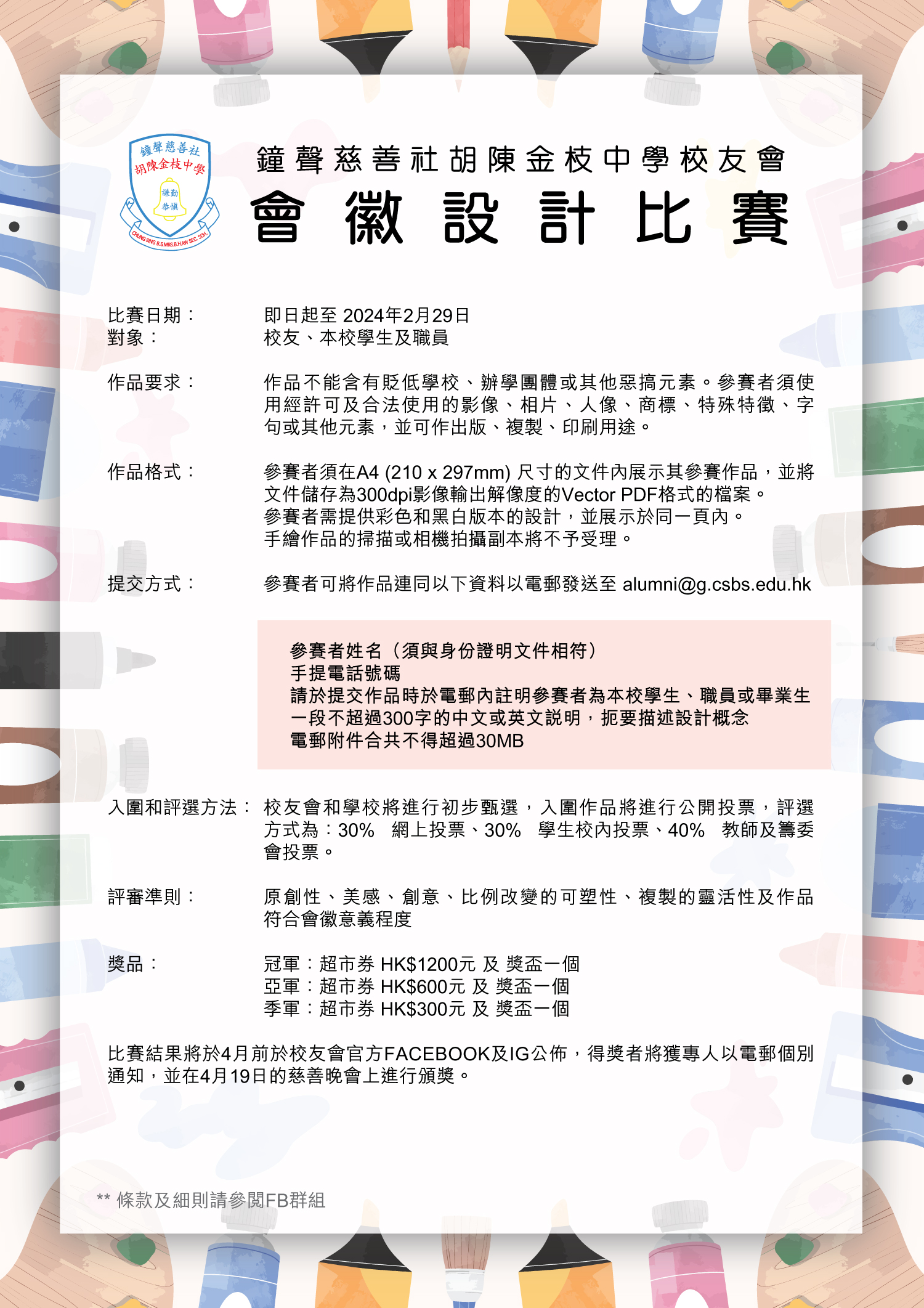 - 請於提交作品時於電郵內註明參賽者為本校學生、職員或畢業生
